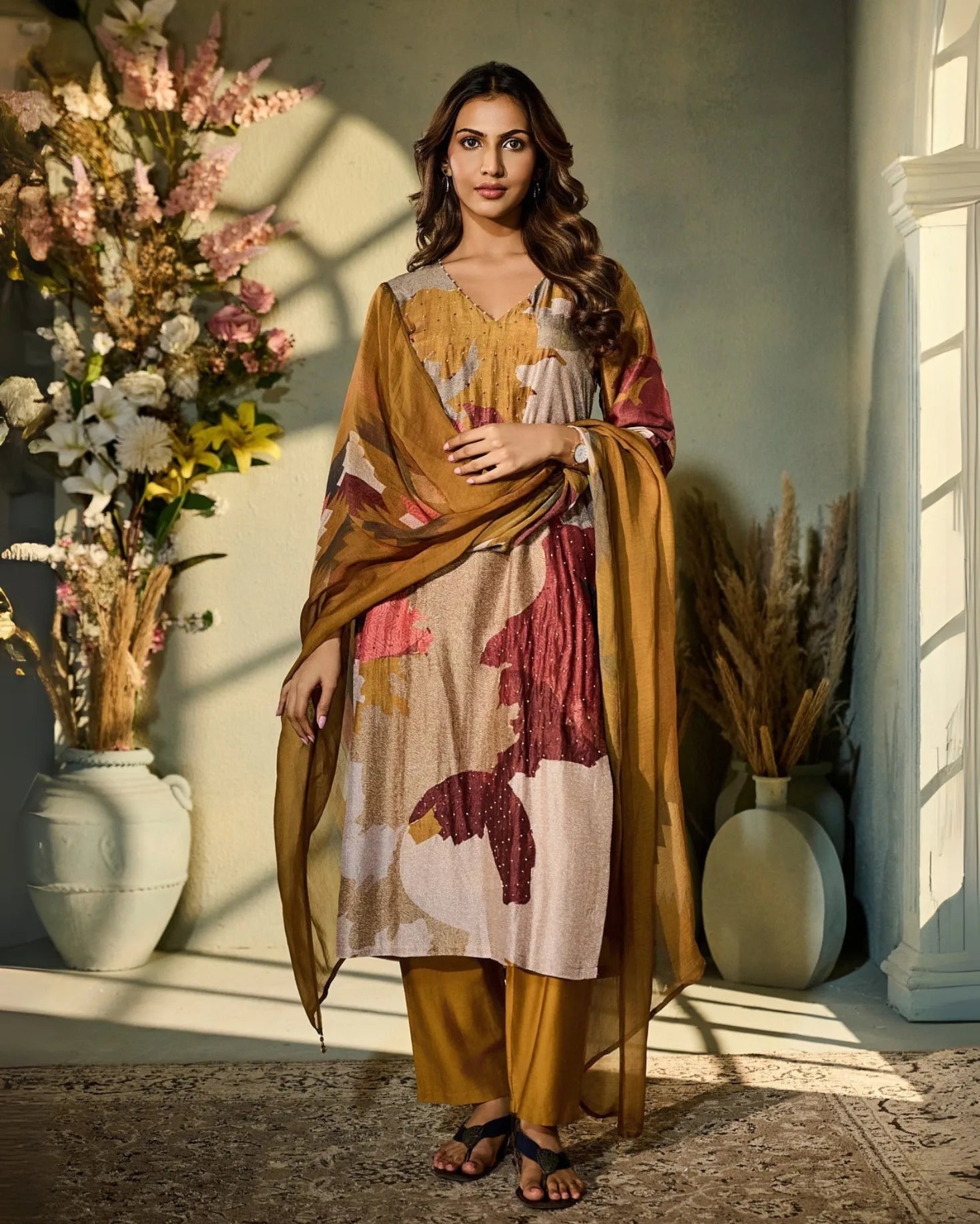 The Chanderi Cotton Salwar Suit is a perfect blend of elegance and comfort! The detailed embroidery work and the stylish round-neck straight Kurti make it an eye-catching ensemble. The fabric is soft and breathable, making it ideal for long festive and wedding celebrations.