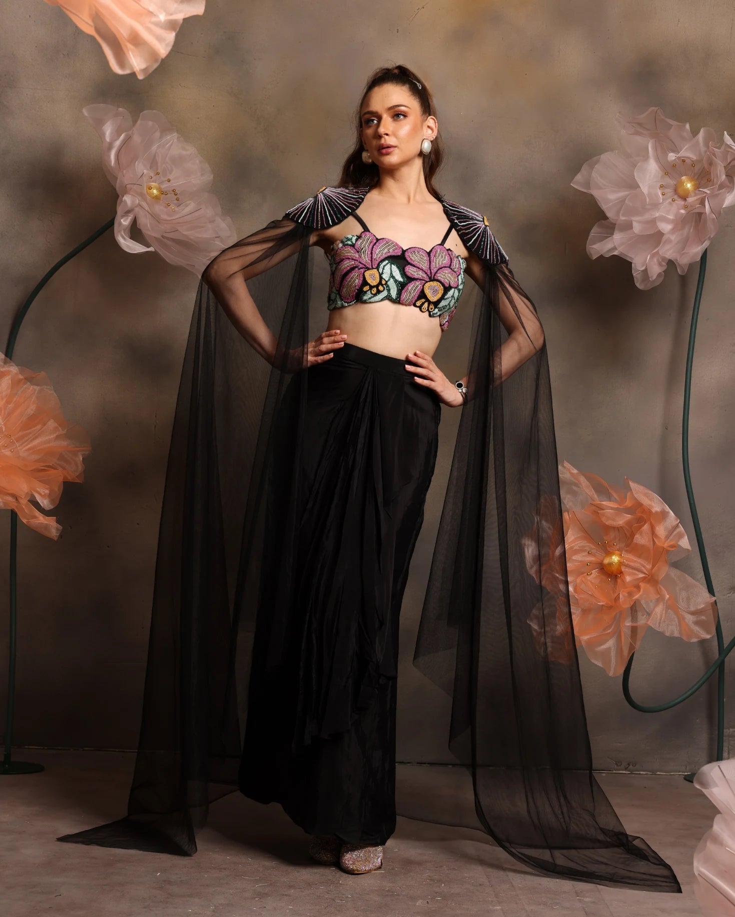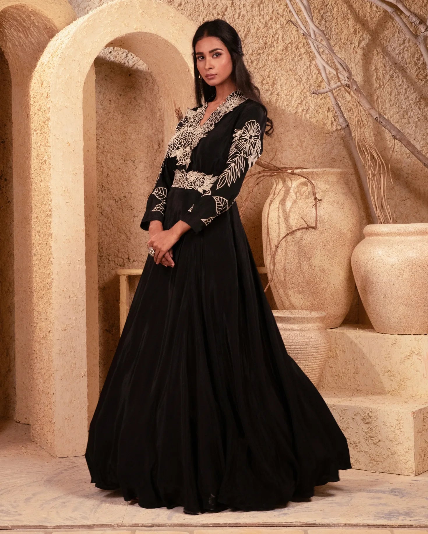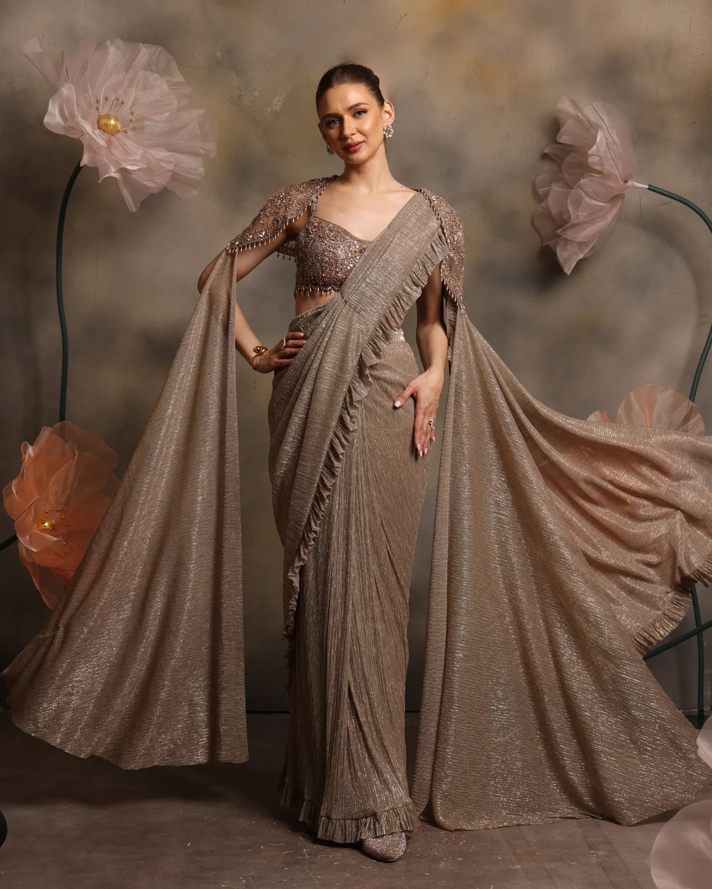 The shimmering Simmer fabric gives the outfits a luxurious and flowy appeal, while the intricate sequin work and elegant patti detailing add a sophisticated touch. The Indo-Western styles are versatile and perfect for modern festive occasions.