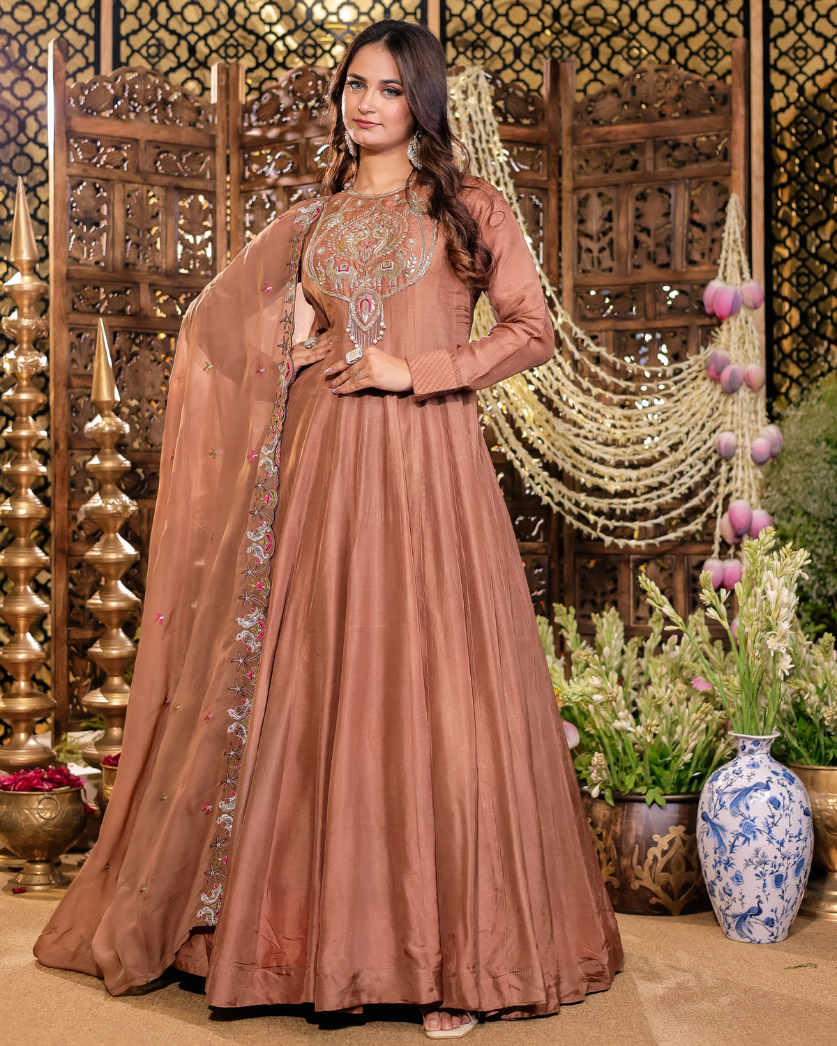 Coffee Brown Anarkali Suit for Women - Embroidered Bodice & Silk Dupatta