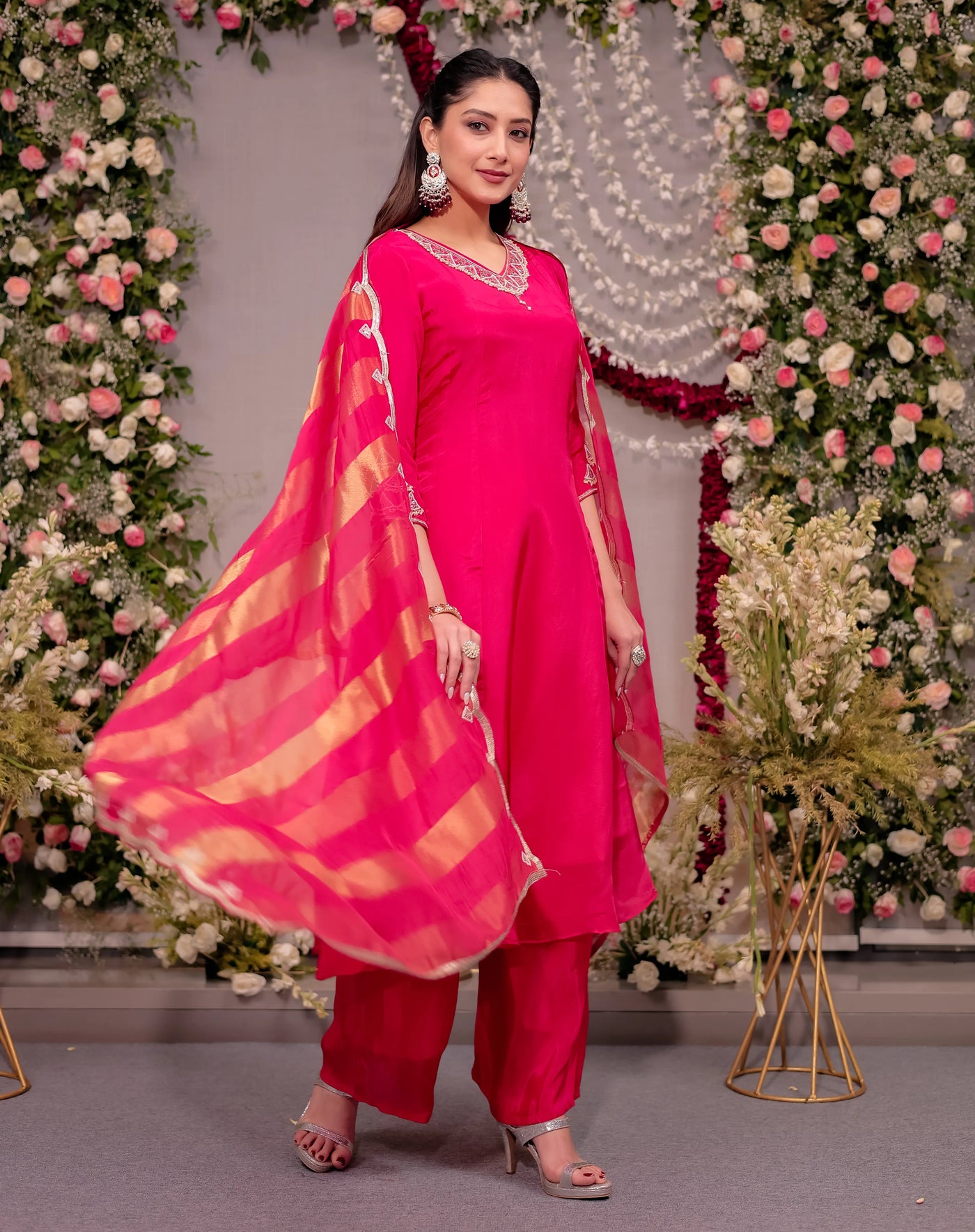 Completing the look is a graceful Banarasi Stripe Dupatta adorned with a delicate Scalloped Border Dupatta finish. The subtle gold stripes beautifully contrast the vibrant pink, elevating this Bright pink silk palazzo suit with gold dupatta into a statement festive ensemble.