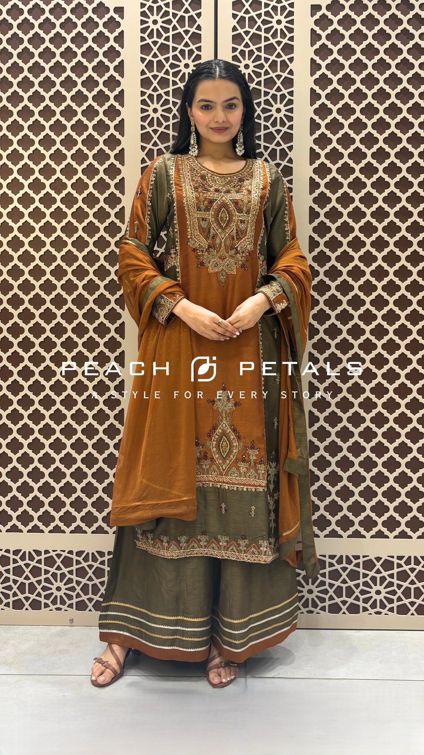 Paired with wide-leg palazzo pants and a coordinated dupatta, this outfit flows effortlessly, making it an ideal choice for autumn weddings, festive gatherings, and cultural celebrations. The two-tone rust and olive palette gives it a modern Pakistani-style suit appeal while staying rooted in classic Indian craftsmanship.