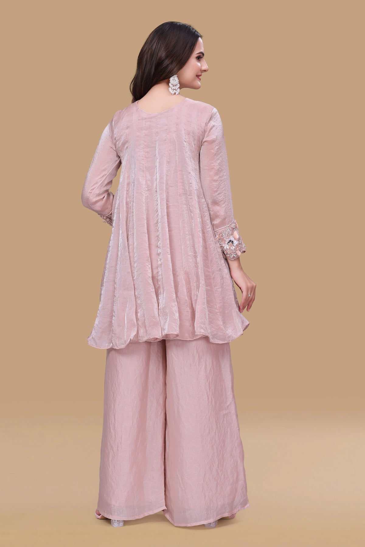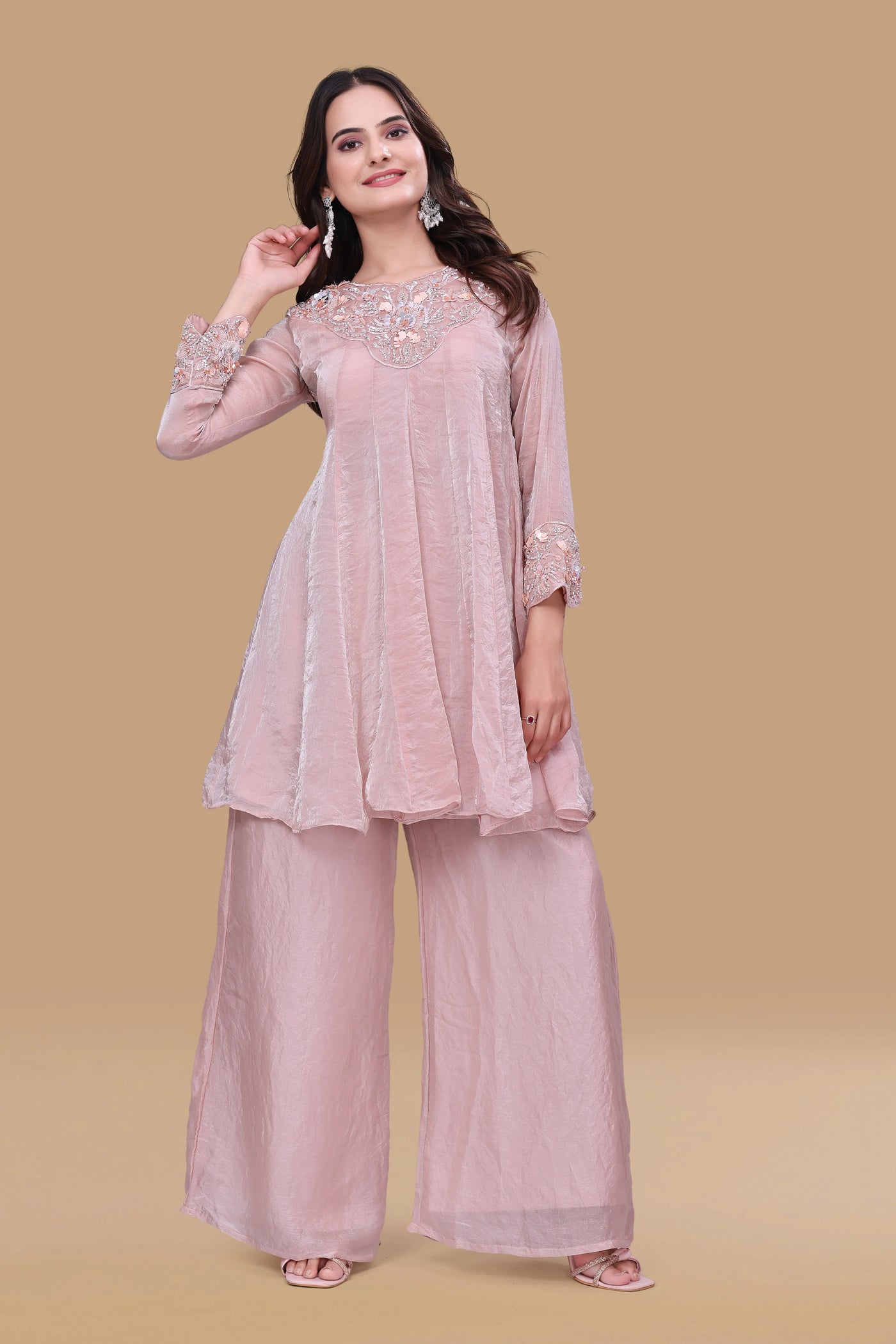 Step into effortless festive elegance with this short kurti and palazzo set, designed for modern women who love fluid silhouettes and understated luxury. The beautifully hand-embroidered neckline with delicate sequin detailing adds a soft shimmer, while the breezy wide-leg pants create graceful movement — perfect for day functions and intimate celebrations.