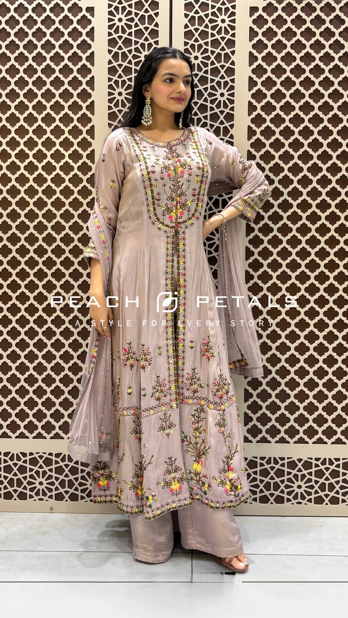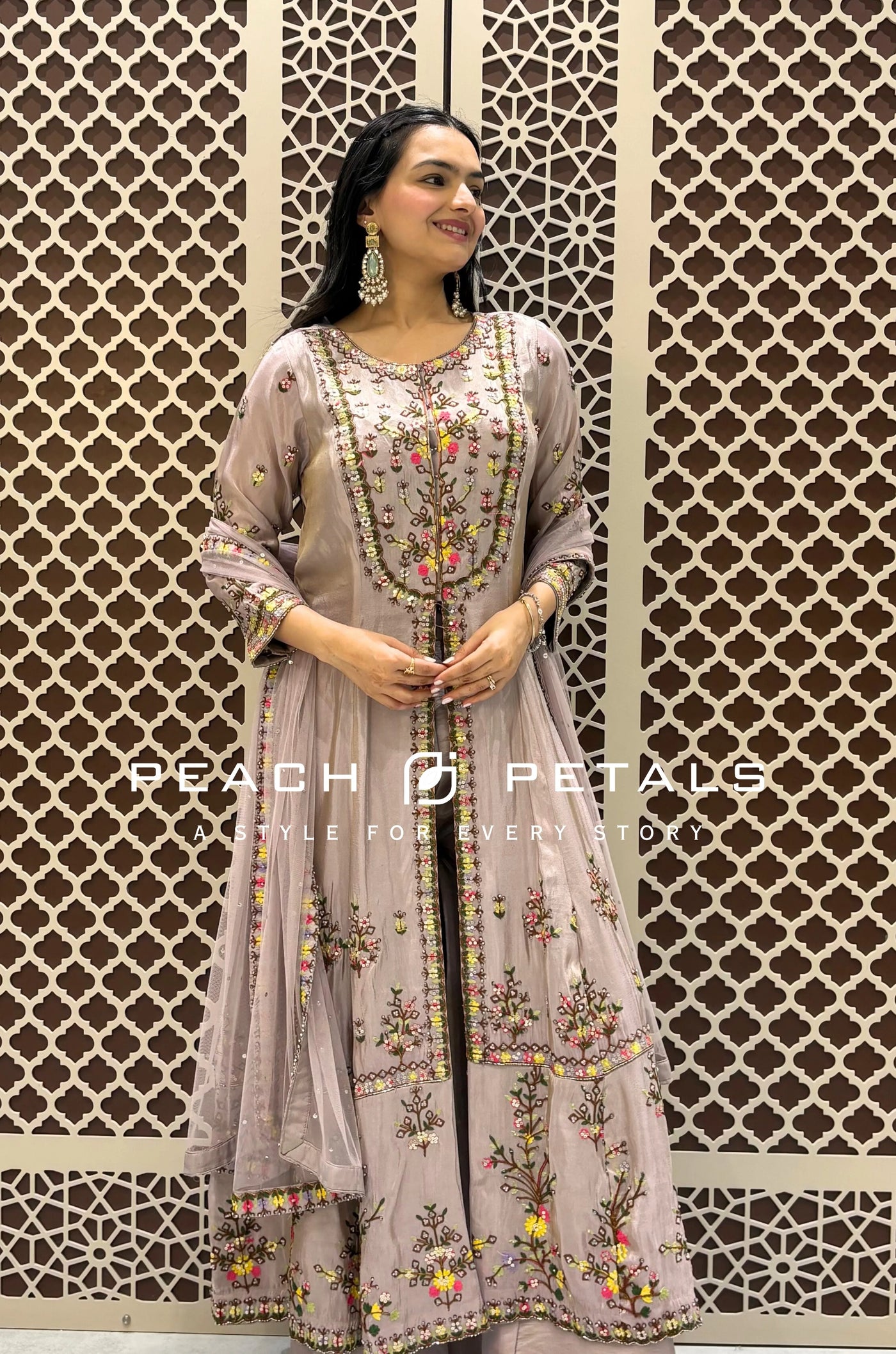 The dust mauve longline tunic with floral embroidery features delicate floral thread work, ethnic suit detailing that adds soft charm without overpowering the look. Styled as a front-open long kurta with palazzo and dupatta, the outfit offers effortless movement and a flattering flow.