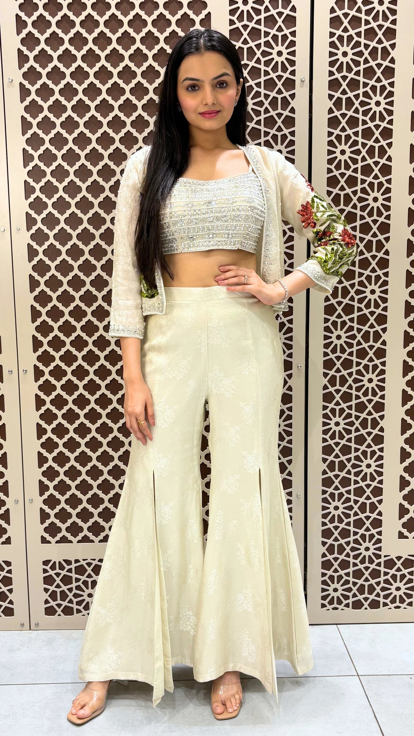 This Ethnic Jacket Set for Women in soft off-white tones is ideal for every special moment — from Mehendi Ceremony Dress vibes to Haldi Celebration Wear, a stylish Sangeet Guest Outfit, or a graceful Modern Reception Look. Lightweight and chic, it’s the perfect Summer Wedding Guest Attire for effortless elegance.