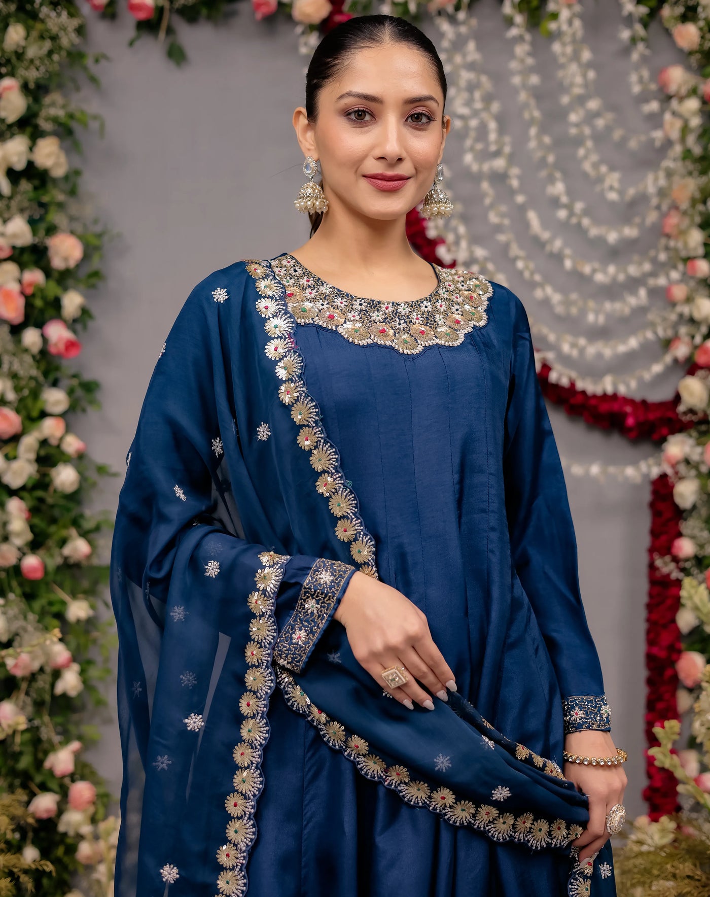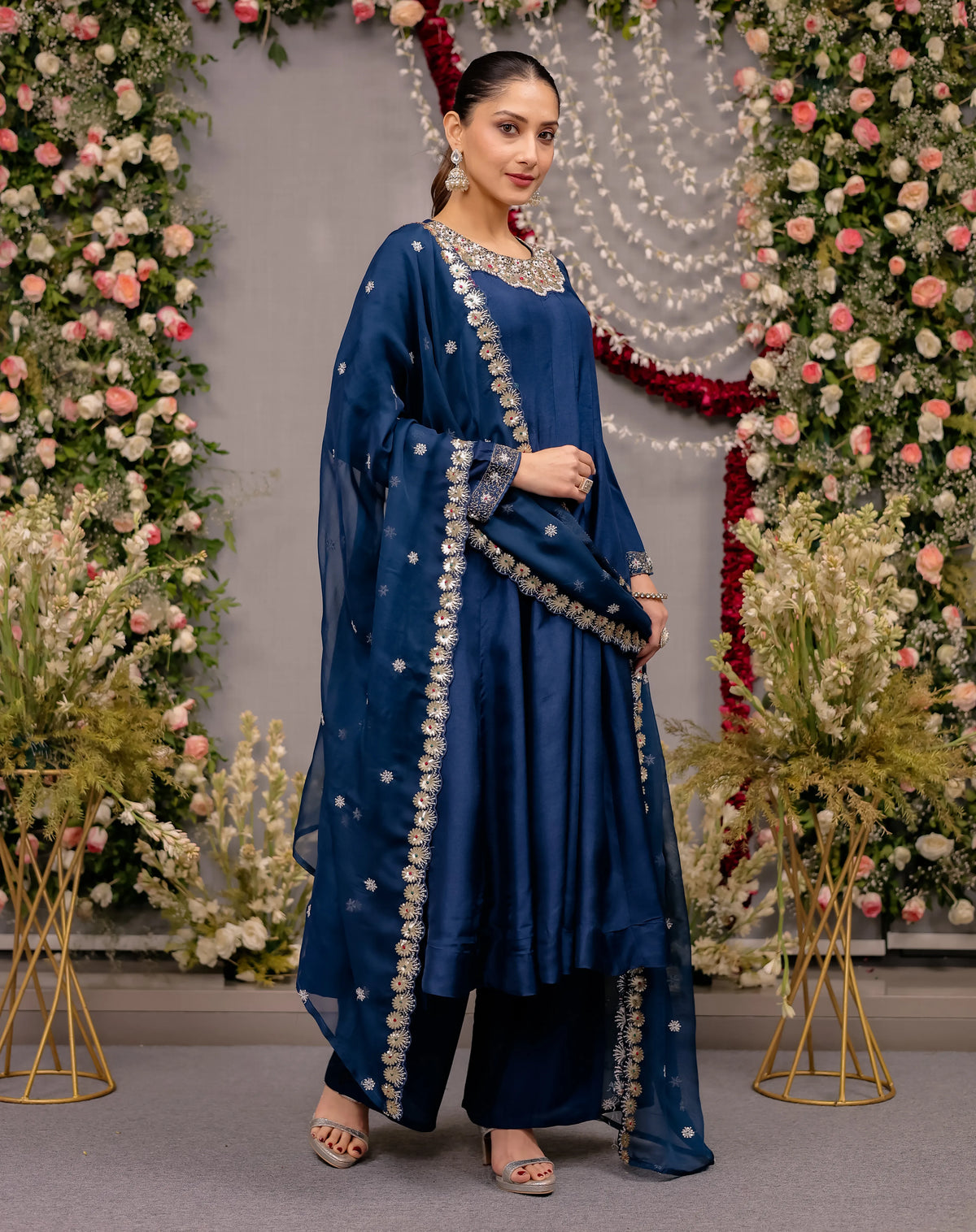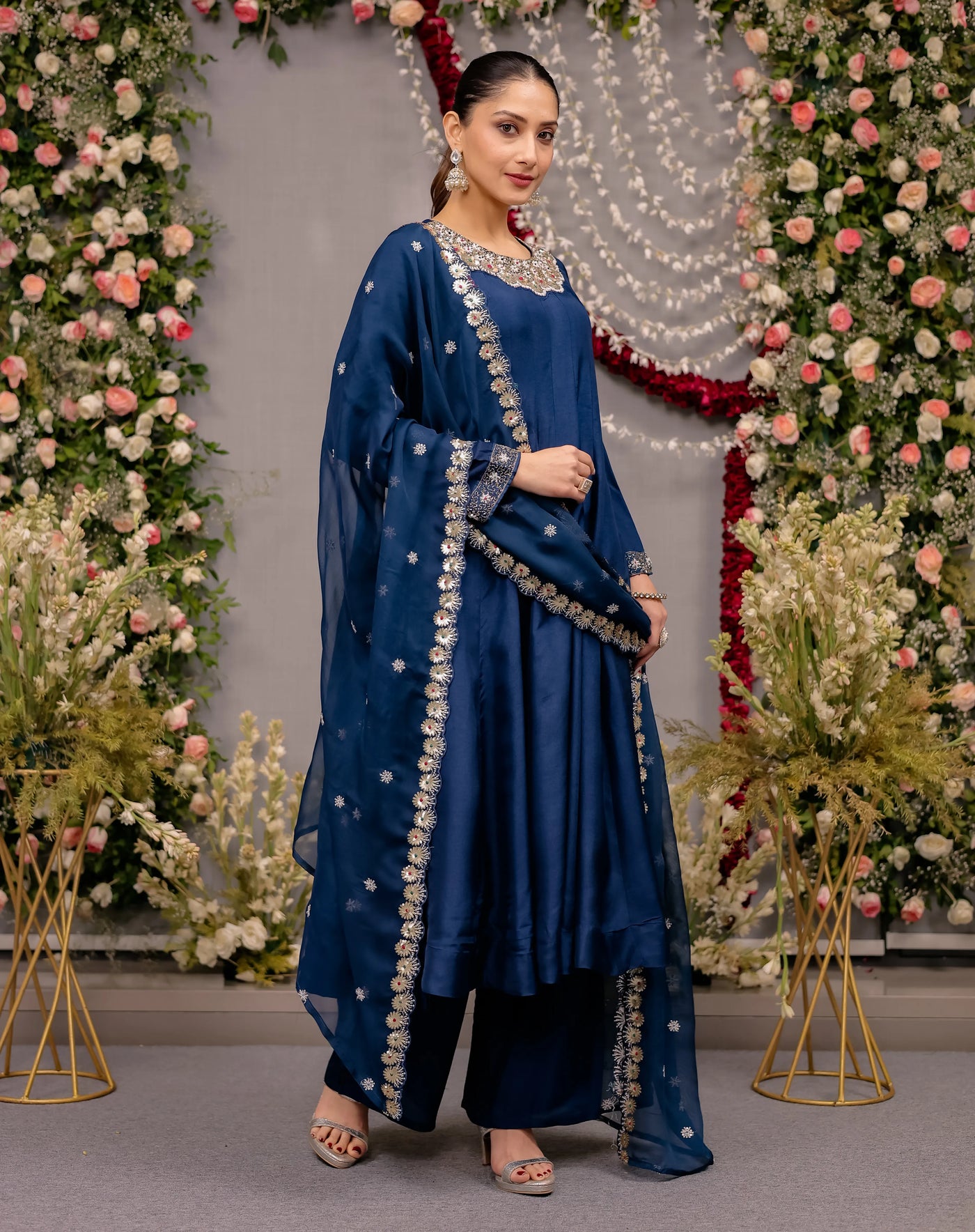 Intricate detailing elevates this look into a statement piece. The neckline and dupatta feature delicate Navy blue Gota Patti work suit set craftsmanship, accented with rich gold embroidery. This Navy blue silk suit with heavy gold embroidery adds a regal finish while maintaining a sophisticated balance.