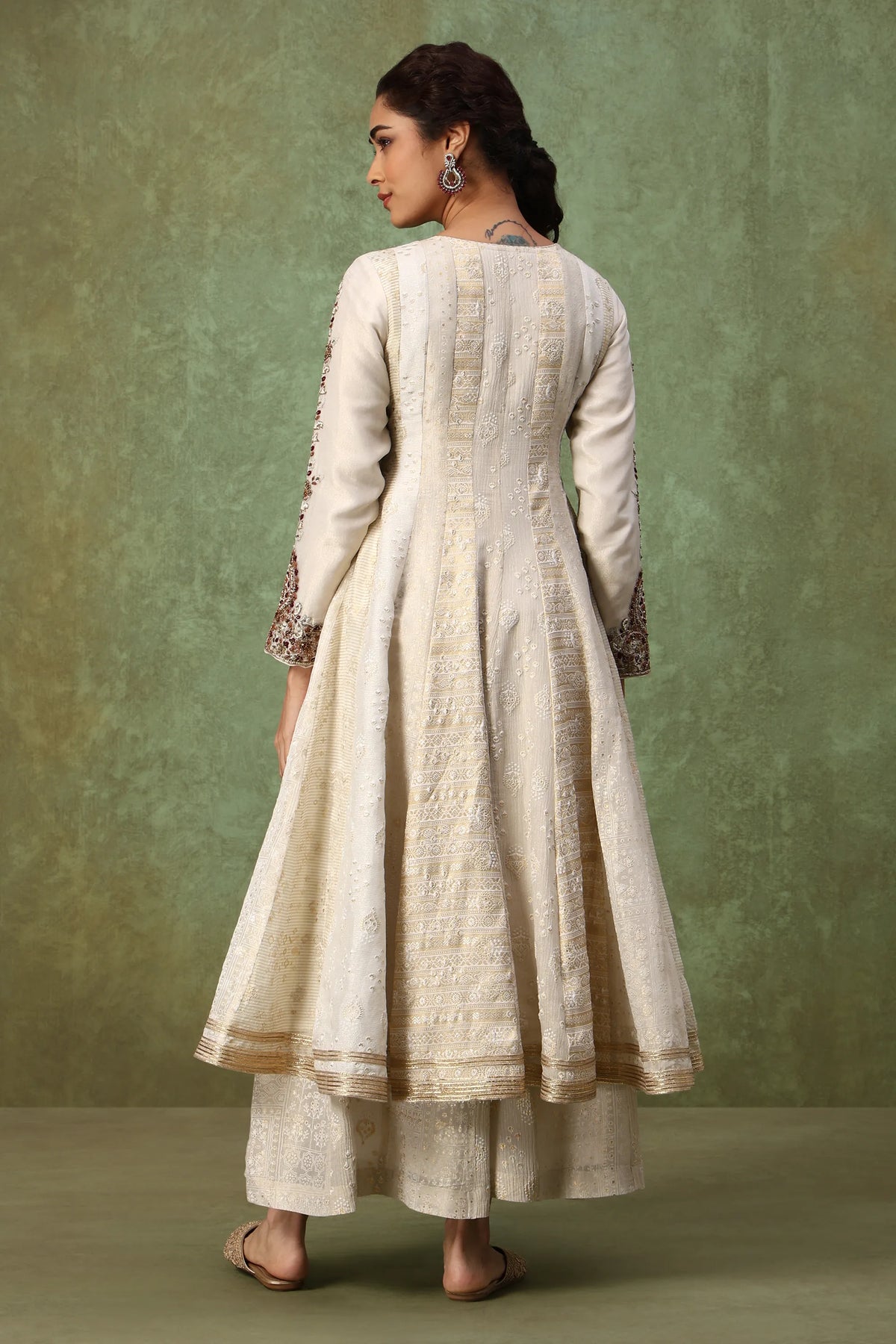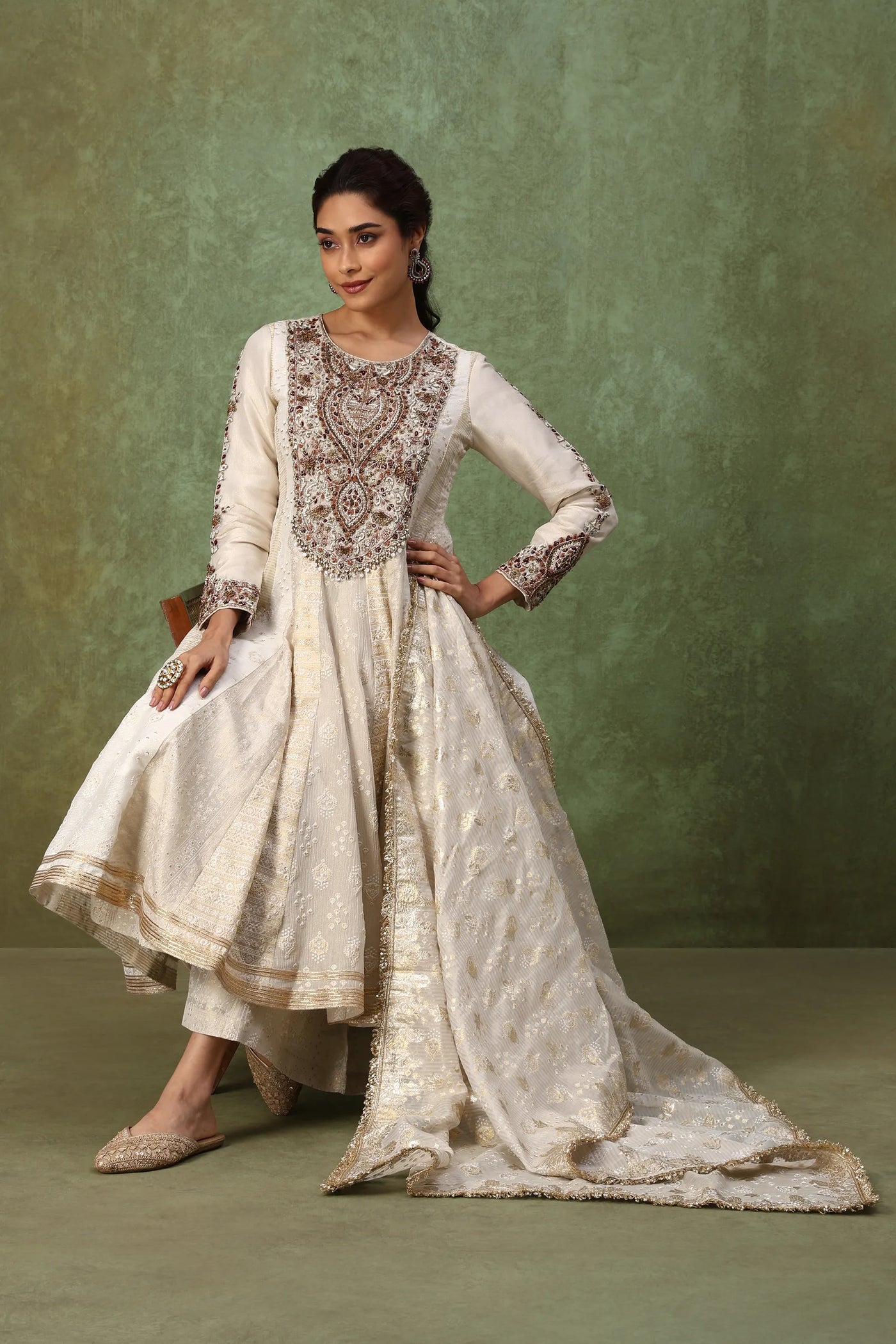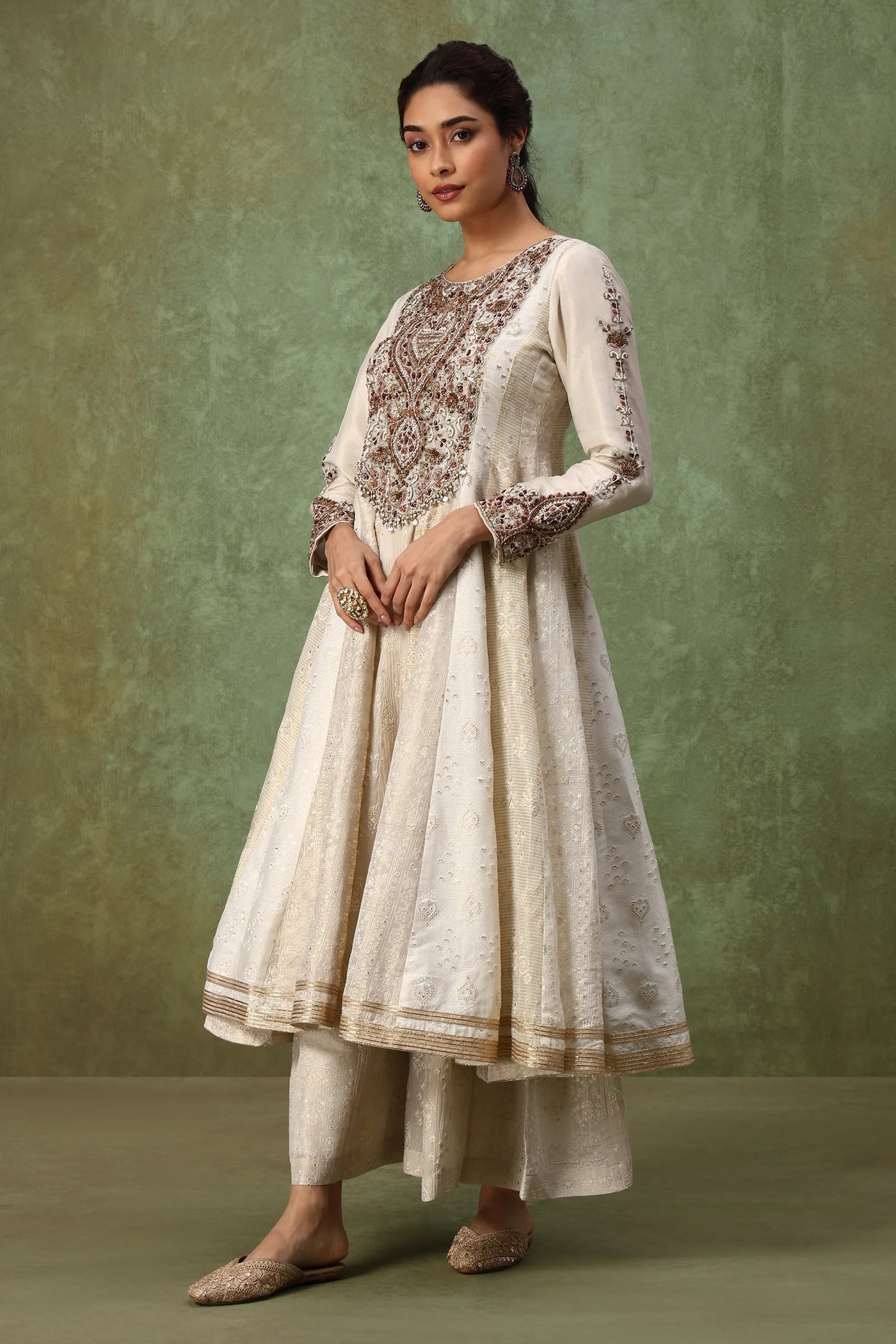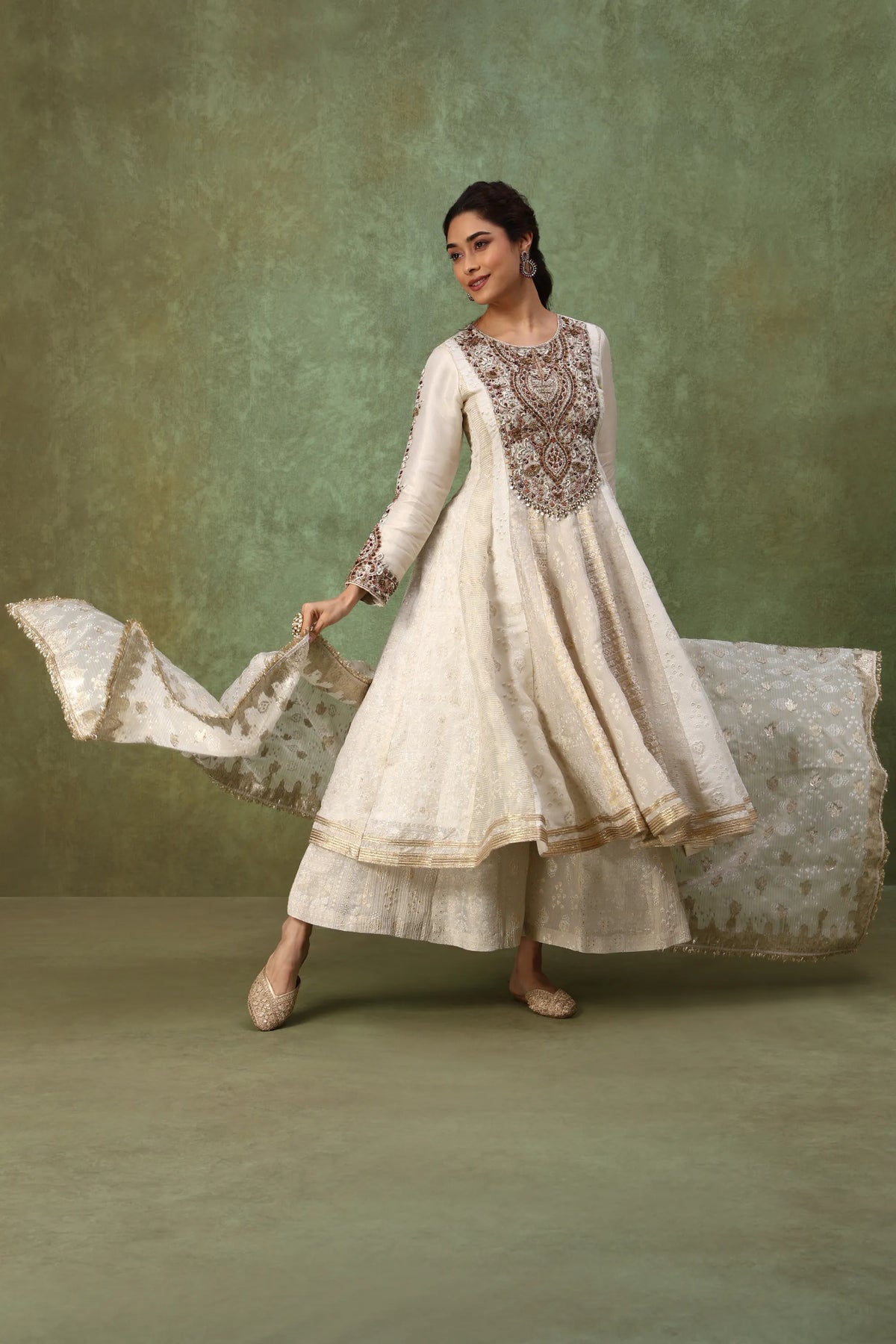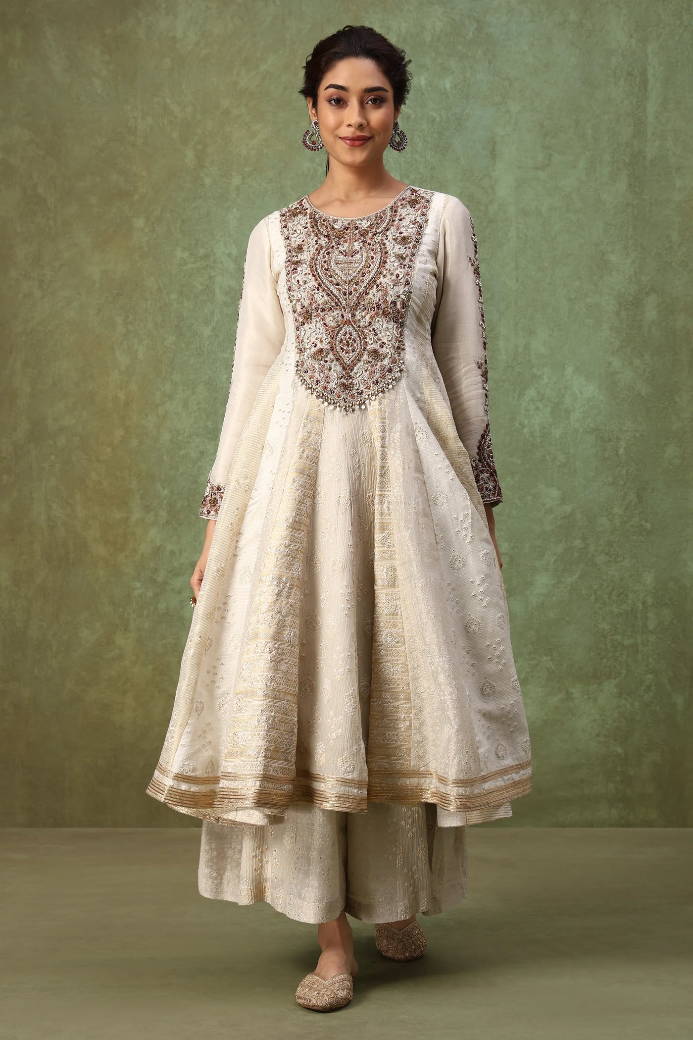 Step into elegance with this designer ivory Anarkali set crafted in a soft silk-blend fabric with delicate self-print textures. Featuring an intricately hand-embroidered antique gold zardosi yoke, embellished sleeve cuffs, and flowy embroidered palazzo pants, this off-white fusion gown brings together classic craftsmanship and modern minimalism. The beaded dupatta with gota patti edging adds the perfect festive finish.