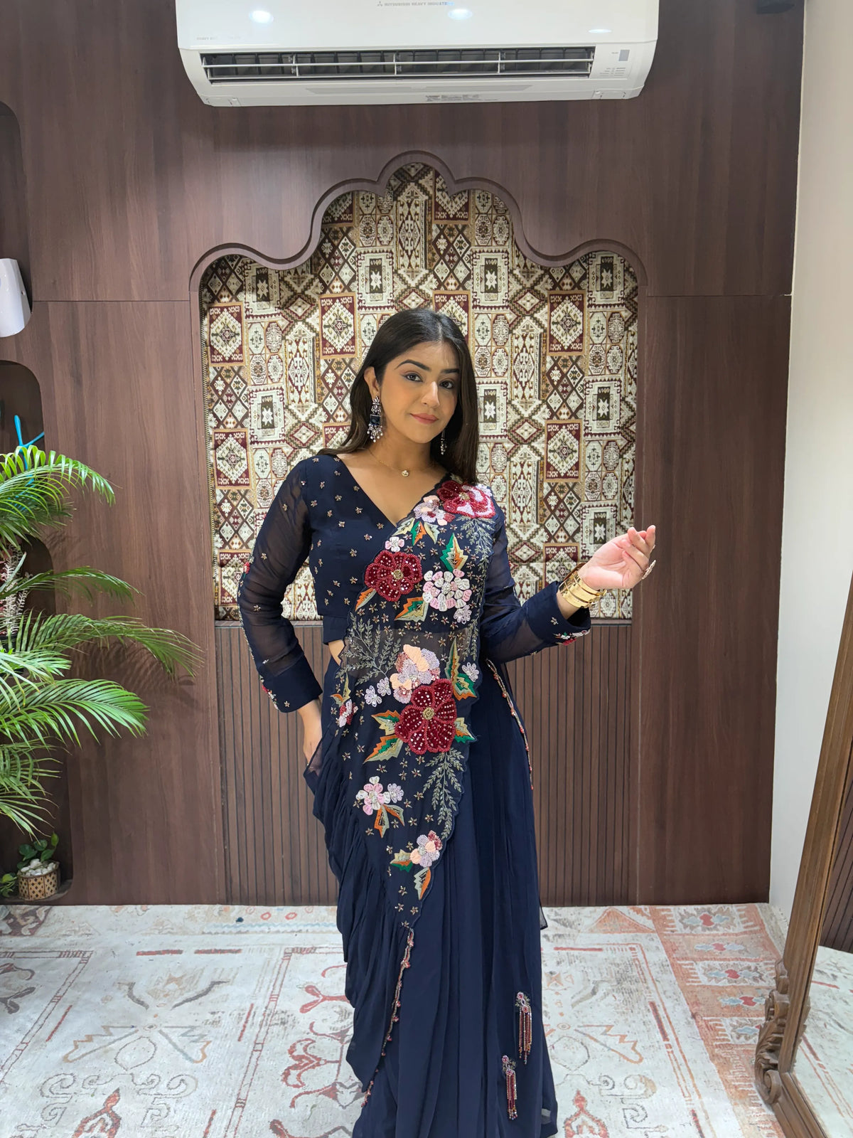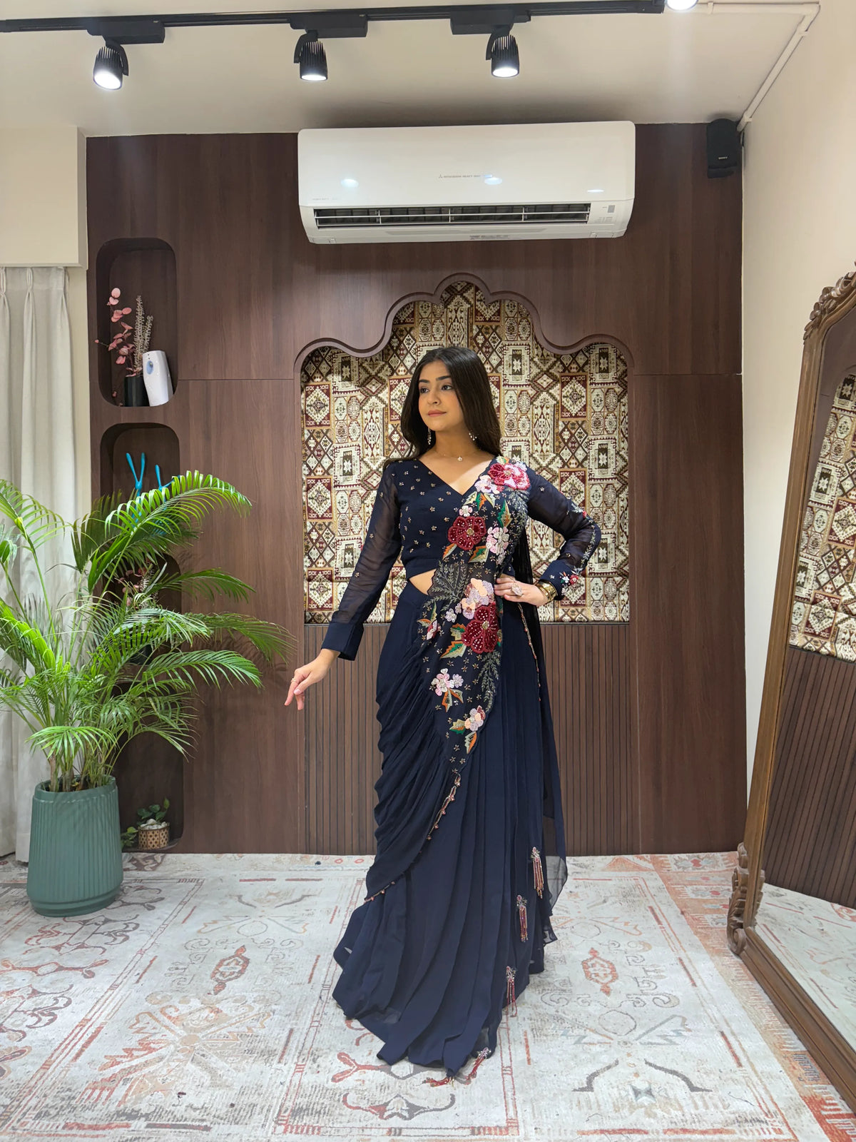 • The Saree: A Ready-to-Wear Concept Saree in a rich midnight blue, featuring a Pleated Navy Chiffon body that flows seamlessly into a pre-structured silhouette.