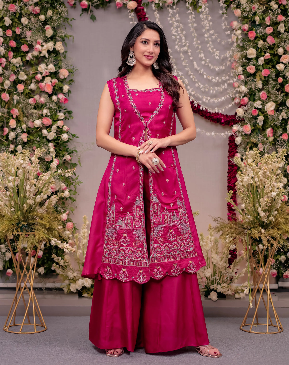 Make a striking statement in this Fuchsia Pink Indo-Western Set, designed for women who love vibrant elegance with a contemporary twist. This stunning Hot Pink Silk Fusion Outfit perfectly blends traditional craftsmanship with modern silhouettes.