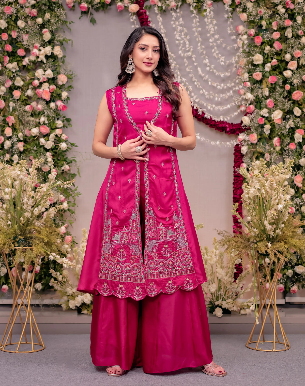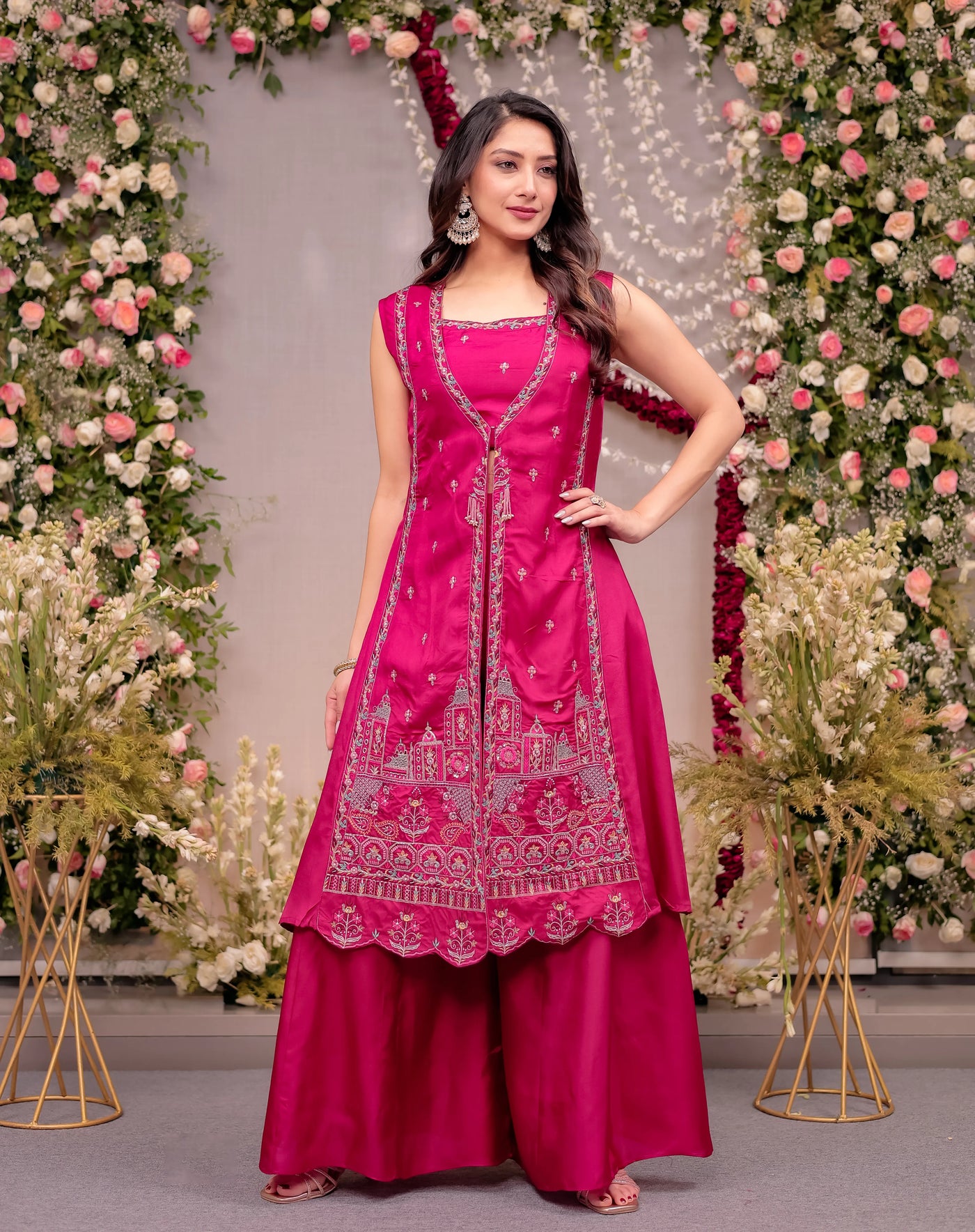 The ensemble features a hot pink crop top and palazzo with a shrug, creating a flattering three-piece combination. The flowing palazzo adds graceful movement, while the structured crop top balances the look with a sleek finish.