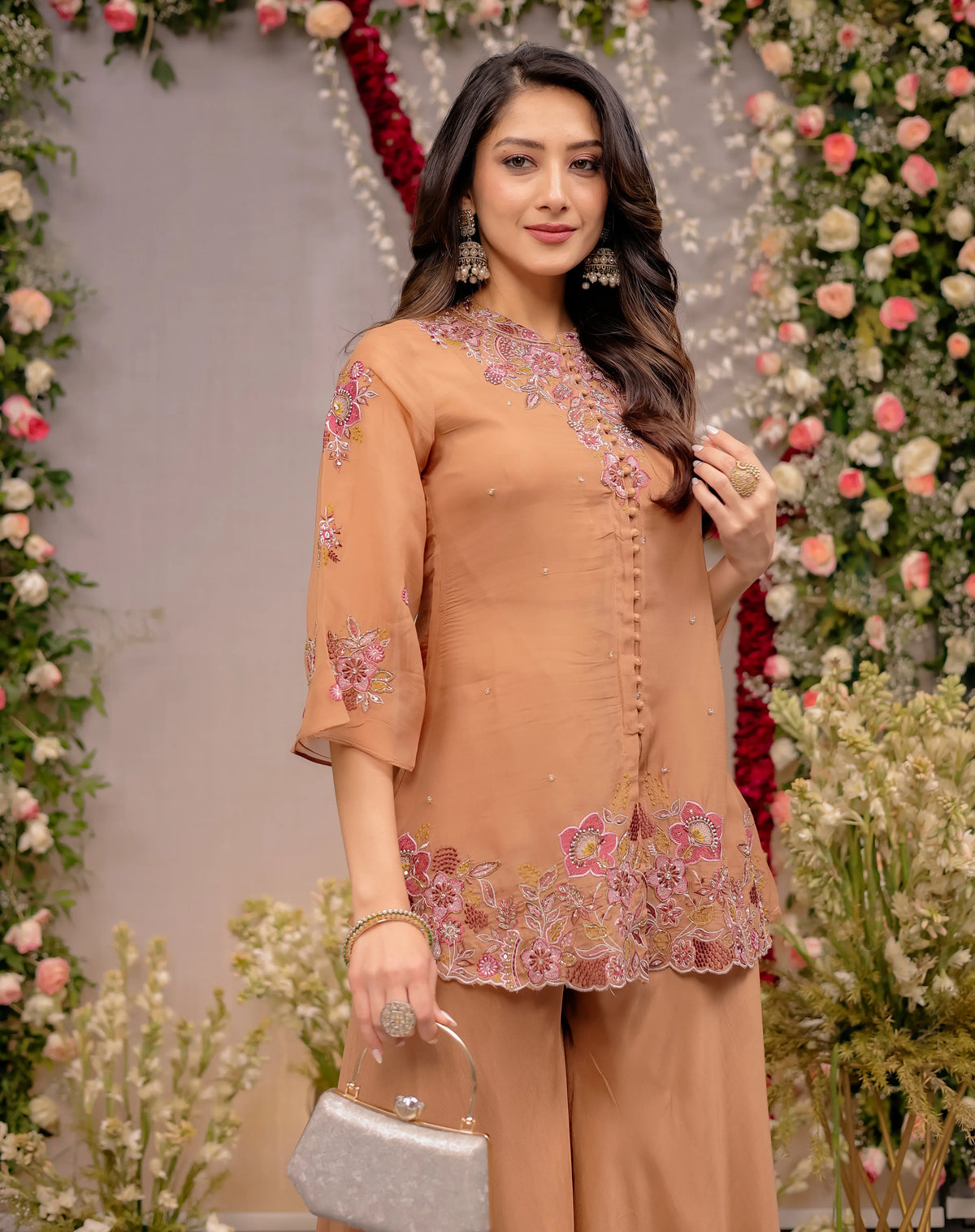 The outfit features a delicately detailed short kurti with sharara, tailored in soft faux georgette that flows beautifully with every step. The scalloped hemline is adorned with intricate floral embroidery, adding depth and richness to this Peach Georgette Tunic with Wide Leg Pants. Subtle zari work, thread embroidery, and fine sequin embellishments enhance its luxurious appeal.