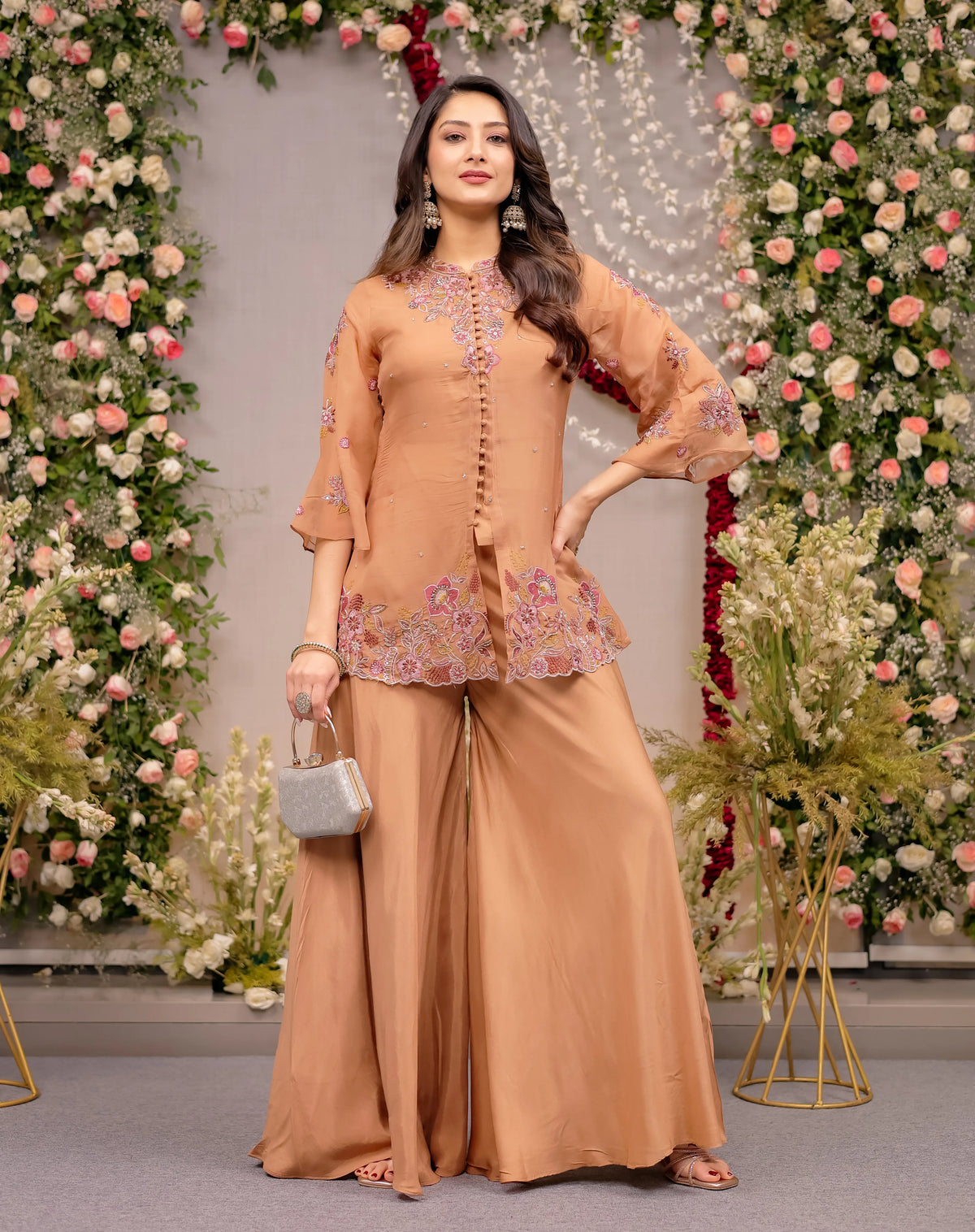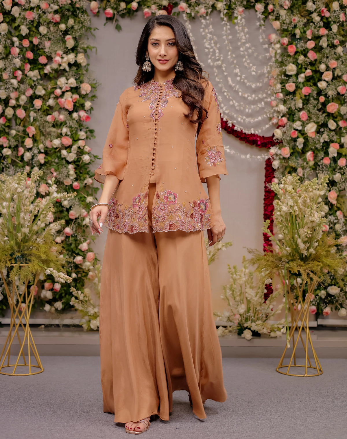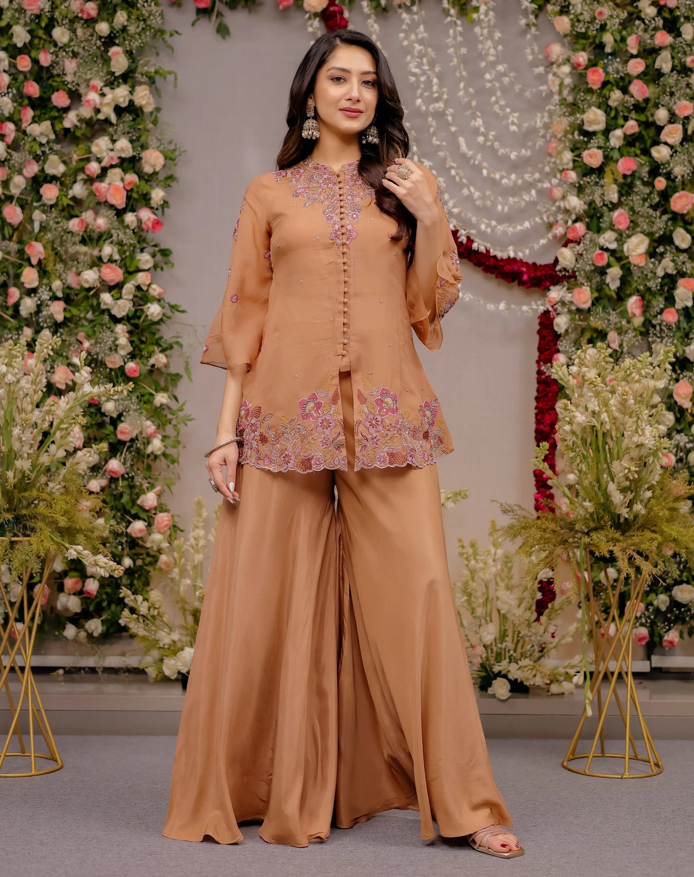 This Floral Embroidered Short Anarkali Sharara silhouette offers a flattering fit, while the wide-leg sharara pants create a graceful, elongated look. The elegant 3/4 flared bell sleeves add a soft, feminine touch, making it a perfect Bell Sleeve Embroidered Tunic Sharara for festive celebrations.