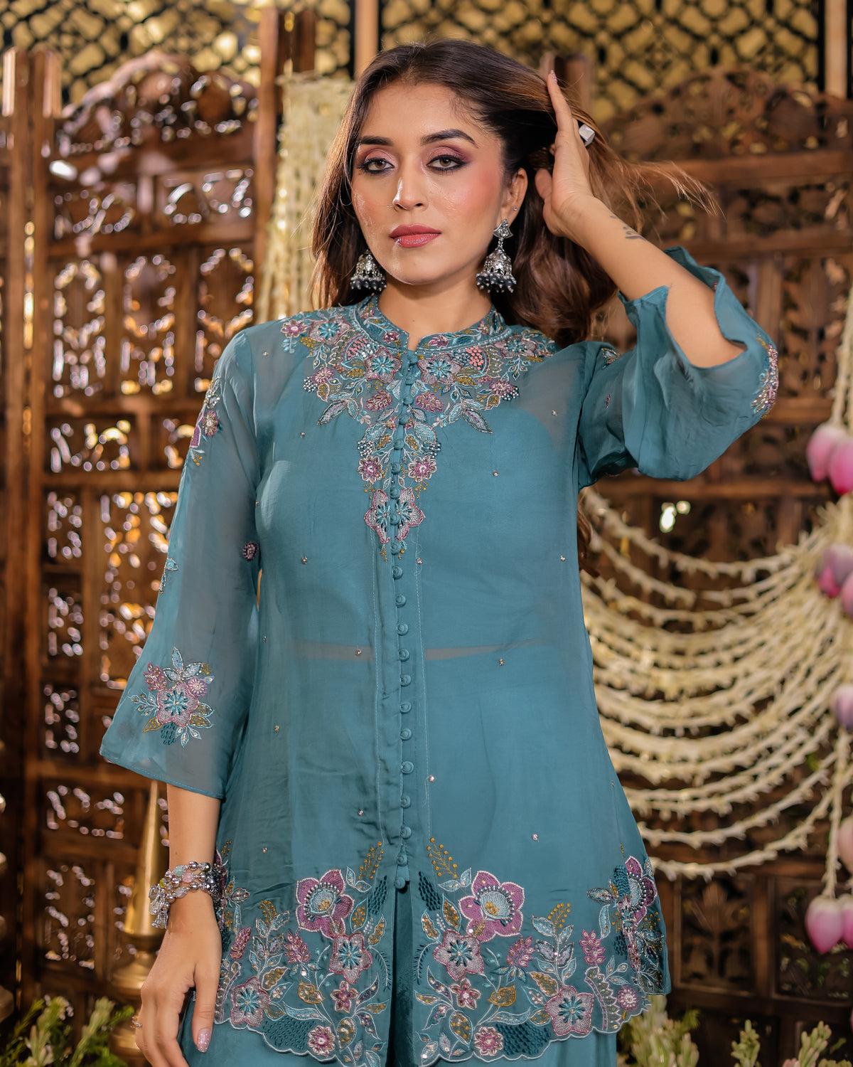 A soothing teal kurti palazzo set designed with delicate floral embroidery and sheer sleeves. The lightweight fabric and elegant flow make it ideal for day festivities and classy gatherings.