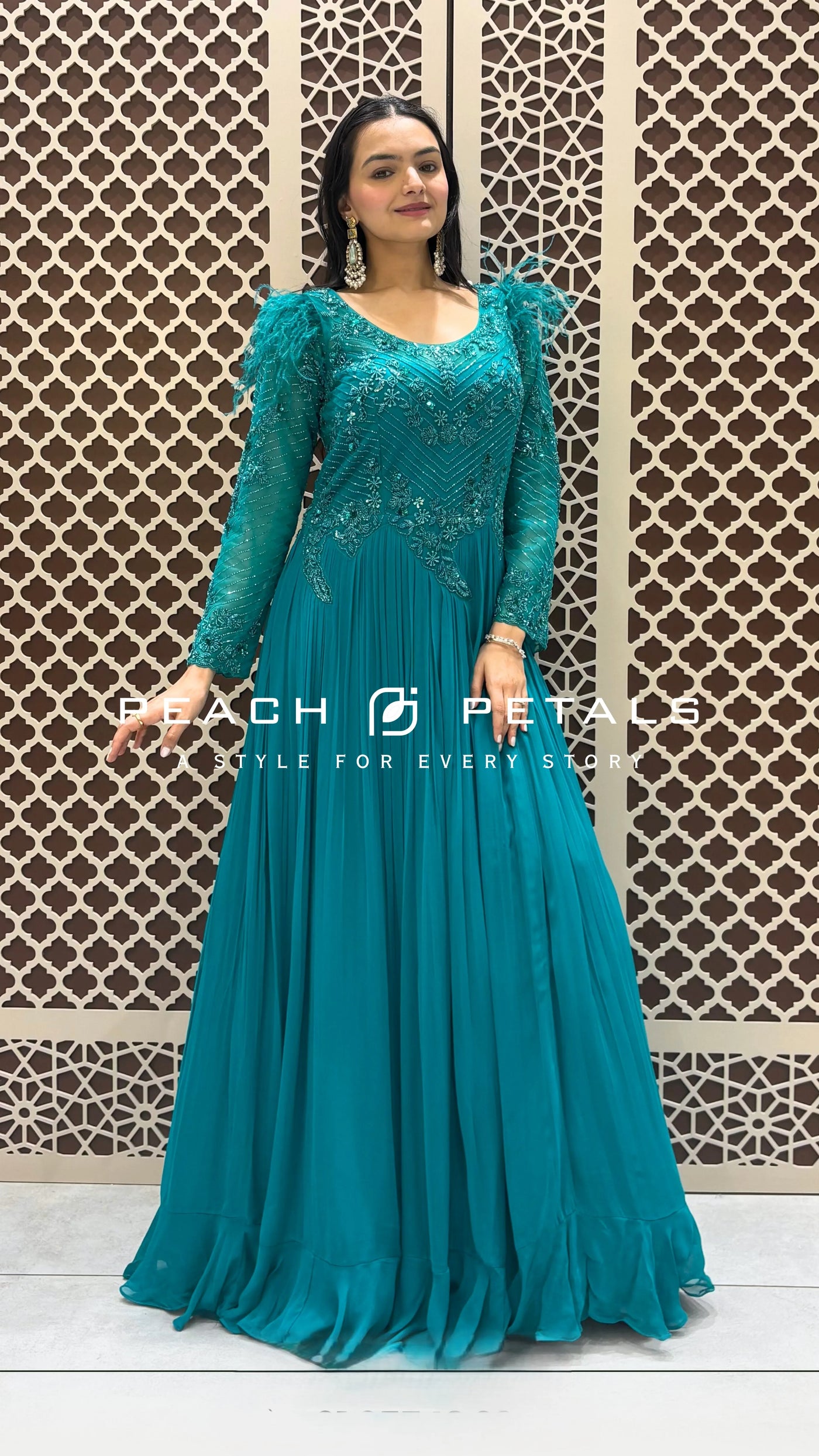 What truly elevates this ensemble is the dramatic feather shoulder detail of the ethnic dress design. The luxurious ostrich feather accent teal gown adds couture flair, transforming it into a true Peach Petals teal party wear gown made for spotlight moments. Designed as a round neck embroidered maxi gown with full sleeves, it balances glamour with elegance.