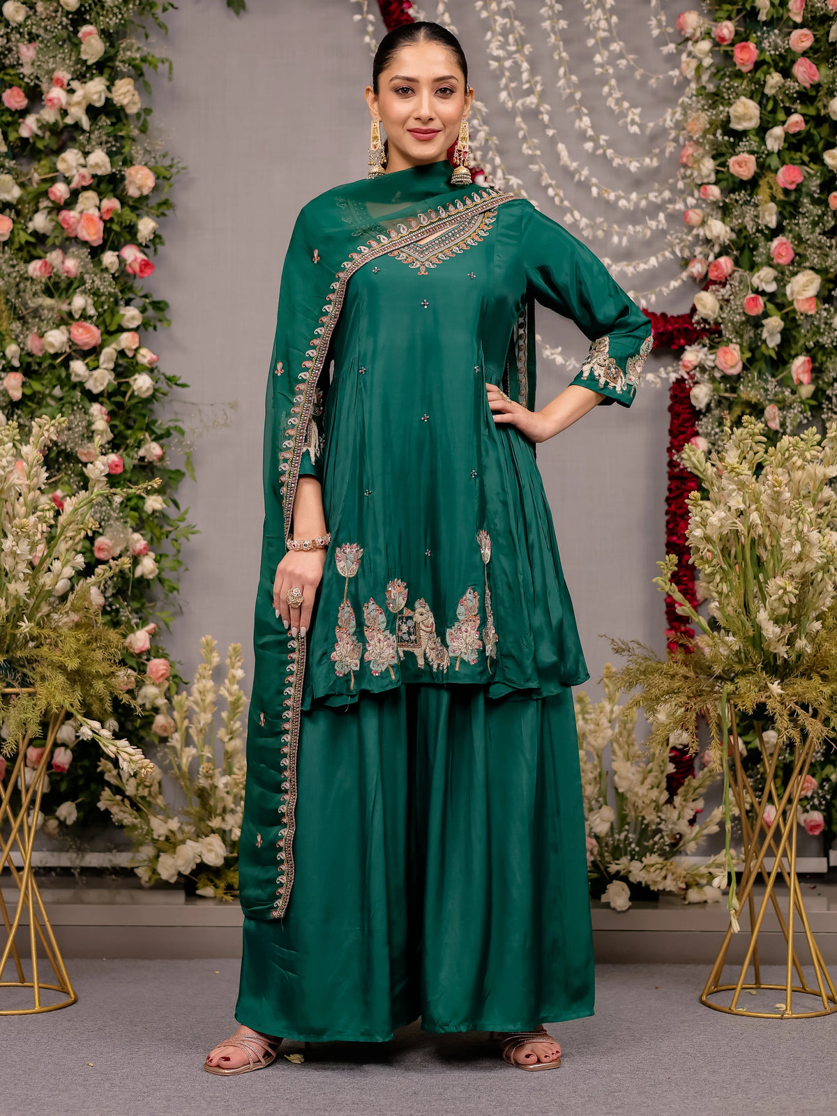 Teal Green Silk Sharara Set with Elephant Motif Embroidery