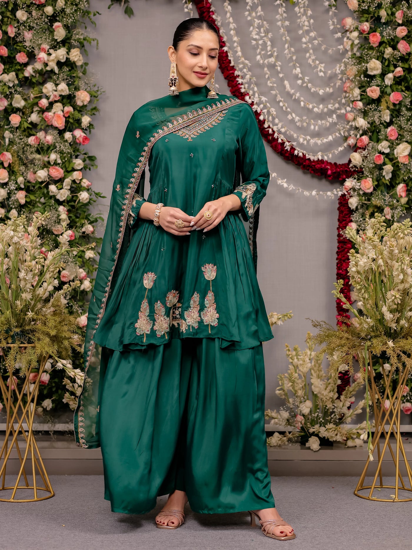 Elevate your festive wardrobe with this elegant emerald green kurta sharara set, crafted in a rich, flowy fabric for a graceful silhouette. The kurta features intricate embroidery along the neckline, sleeves, and hem, enhanced with delicate traditional motifs that add a regal touch. Paired with wide-flared sharara pants for effortless movement and a matching embroidered dupatta, this ensemble is perfect for weddings, festive celebrations, and special occasions. Style it with statement earrings and heels for a timeless ethnic look.